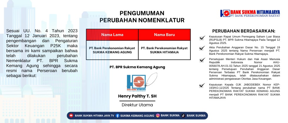 BPR Sukma Hitamajaya merupakan sebuah lembaga keuangan bank yang menerima simpanan dari masyarakat dan penyaluran kredit untuk pengusaha mikro, kecil dan menengah. Dana simpanan dari masyarakat dalam bentuk tabungan dan deposito disalurkan ke masyarakat melalui pemberian kredit untuk keperluan modal usaha maupun keperluan pribadi.