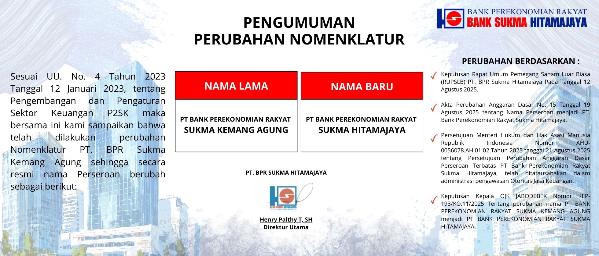BPR Sukma Hitamajaya merupakan sebuah lembaga keuangan bank yang menerima simpanan dari masyarakat dan penyaluran kredit untuk pengusaha mikro, kecil dan menengah. Dana simpanan dari masyarakat dalam bentuk tabungan dan deposito disalurkan ke masyarakat melalui pemberian kredit untuk keperluan modal usaha maupun keperluan pribadi.